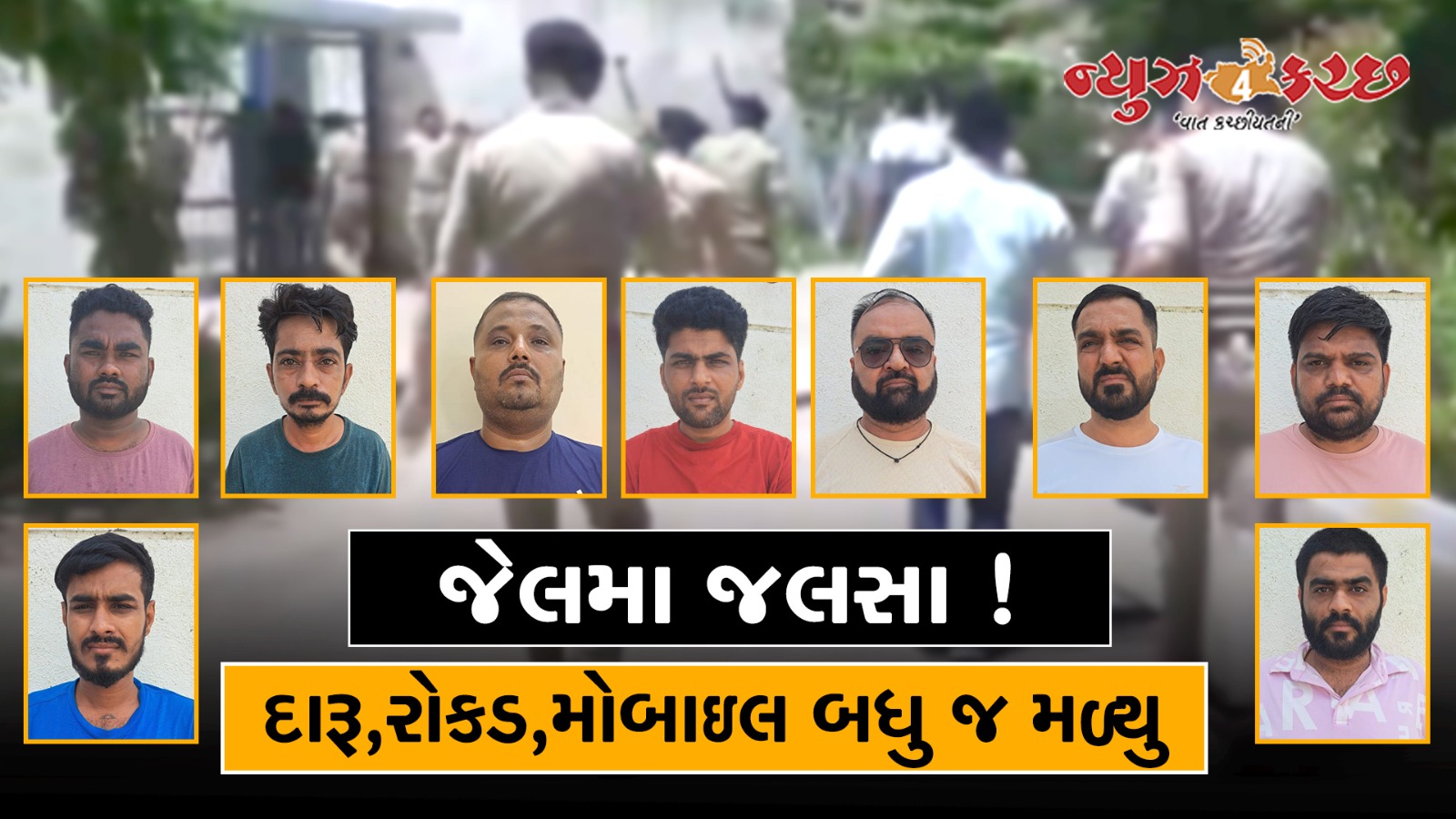 પુર્વ કચ્છ પોલીસે જેલમાં ચાલતી લોલમલોલ નો પ્રર્દાફાસ કરી દારૂની મહેફીલ,રોકડ રૂપીયા મોબાઇલ સહિત કુખ્યાત શખ્સોને જેલમાંથી જલસા કરતા રગંહાથ પકડી પાડ્તા ફરી એક વાર જેલની સુરક્ષા વ્યવસ્થા સામે અનેક સવાલો ઉભા થયા છે.આમતો સામાન્ય લોકોમાં પણ ચર્ચા થતી હોય છે કે જેલમાં પણ દરેક વસ્તુ મળી જાય છે. અને તેની રકમ ફીક્સ છે. તમે માંગો એ પૈસા આપી મળે છે.શનિવારે રાત્રે બાતમી મળી હતી કે પુર્વ કચ્છના ગાંધીધામમા આવેલી ગળપાદર જેલમાં ગેરકાયદેસર પ્રવૃતિઓ થઇ રહી છે જે આધારે ખાનગી બસમા પહોચી દરોડો પાડ્યો હતો. જે દરમ્યાન જેલમાં દારૂની મહેફિલ માણતાં કાચા કામના ૬ કેદીઓ પકડાઇ ગયા હતા જેમાં ભચાઉના રીઢા બૂટલેગર યુવરાજસિંહ જાડેજા કે જે તાજેતરમાજ પોલીસ કર્મચારી સાથે દારૂની હેરફેર તથા પોલીસ પર કાર ચડાવવા મામલે ચર્ચામાં આવ્યો હતો ઉપરાંત જેન્તી ભાનુશાલી મર્ડર કેસના આરોપી સુરજીત પરદેશી,ગાંધીધામનો રીઢો બૂટલેગર મનોજ ઊર્ફે પકાડો માતંગ, હત્યા, આર્મ્સ એક્ટ, હિંસક હુમલા સહિતના બાર ગુનામા સામેલ હિતેન્દ્ર ઝાલા, ૧૯ જેટલા ગંભીર ગુનામાં સામેલ રઝાક ઊર્ફે સોપારી દાઉદ ચાવડા,ચીરઇનો બૂટલેગર શિવભદ્ર જાડેજા સામેલ હતા જે જેલમાંજ દારૂની મહેફિલમાં માણતા હતા તો તૈ પૈકીના ચાર રીઢા આરોપીઓના કબજામાંથી બે એપલ આઈ ફોન મળી ૪ ફોન અને બે ચાર્જર પણ મળી આવ્યાં હતા તો કાર્યવાહી દરમ્યાન રોહિતસંગ ઉર્ફે સોનુ ઠાકુર ગોવિંદ હરજી મહેશ્ર્વરી,શિવભદ્ર જાડેજા પણ સામેલ હતા તો સાથે તપાસ દરમ્યાન બેરેકની છત પરથી રોકડા પચાસ હજાર રૂપીયા પણ મળી આવ્યા હતા. આમ પોલીસે કુલ ૧ લાખ ૪૦ રૂપિયાનો મુદ્દામાલ કબજે કરી આરોપીઓ વિરુદ્ધ દારૂબંધી અને મોબાઈલ ફોન રાખવા સહિતના અલગ-અલગ ગુના દાખલ કર્યાં છે.