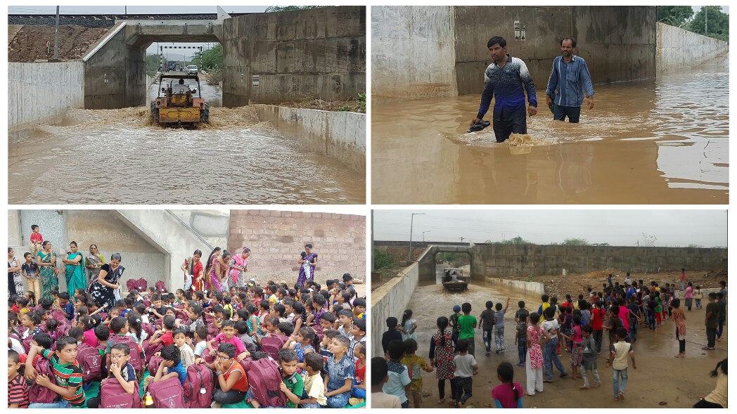 કચ્છમાં વરસાદ ભલે હજુ પાપા પગી કરતો હોય પરંતુ થોડા વરસાદમાંજ સમસ્યાઓ દોડતી થઇ ગઇ છે ગઇકાલે પડેલા થોડા વરસાદને પગલે ભુજમાં પણ લોકો માટે ચોક્કસ વિસ્તારોમાં મુશ્કેલી સર્જાઇ હતી ત્યારે સુખપરમાં એક નાનકડા અન્ડરબ્રીજમાં થોડા વરસાદે 4 ફુટ જેટલુ પાણી ભરાઇ જતા સુખપરને માંડવી સાથે જોડતો માર્ગ અને વાહનવ્યવહાર બંધ થઇ ગયો હતો જો કે હદ્દ તો ત્યારે થઇ જ્યારે સવારે શિશુમંદિર જવા માટે બાળકો ત્યા પહોચ્યા ત્યારે તેમને સાચી સમસ્યાનો ખ્યાલ આવ્યો અને તેથીજ શાળાએ બાળકોને અન્ડરબ્રીજ નજીકજ અભ્યાસ કરવા માટે બેસાડી દિધા અને ગાંધીગીરી કરી અનોખી રીતે તંત્રના કાન આંબડવાનો પ્રયત્ન કર્યો રિધ્ધીસિધ્ધી સોસાયટી સહિત શિશુમંદિર પણ આવેલુ છે પરંતુ આજે બાળકો શાળાએ પહોંચી શકે તેમ ન હોતા ગામના આગેવાનો અને સ્કુલના સંચાલકોએ બાળકોને ત્યાજ અભ્યાસ કરાવ્યો તો રેલ્વે પ્રસાશને ફોન ન ઉપાડતા ગ્રામલોકેએ જાતેજ પાણી કાઢવાનો પ્રયત્ન કરી સમસ્યા દુર કરવાનો પ્રયાસો કર્યો હતો. જો કે શાળાના બાળકોને શિક્ષકોએ ખુલ્લામાંજ અભ્યાસ કરાવ્યો હતો.