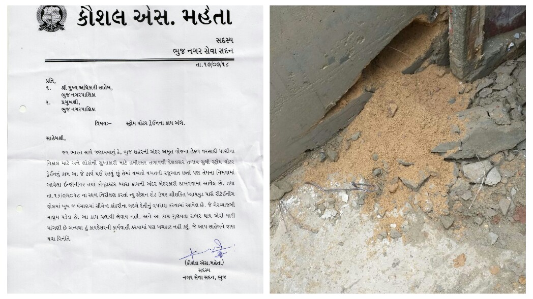 ભુજ પાલિકાના ભાજપના જ નગરસેવક કૌશલ મહેતાએ તારીખ ૧૬ અને ૧૭ જુલાઈના બે અલગ અલગ પત્રો ચીફ ઓફિસરને લખ્યા છે આ પત્રોમાં વરસાદી પાણીના નિકાલ માટેનું સ્ટ્રોમ વોટરનું કામ કરતા કોન્ટ્રકટર અને તેનું સુપરવીઝન કરતી એજન્સી ઉપર ચોંકાવનારા આક્ષેપો સાથે ફરિયાદ કરી છે અને જરૂર પડે કાનૂની કાર્યવાહીની આકરી ચીમકી ઉચ્ચારી છે. જેમાં હમીરસર તળાવ થી સ્ટેશનરોડ સુધી વરસાદી પાણીના નિકાલની કામગીરી કરતી કોન્ટ્રકટર એજન્સી દ્વારા નબળી ગુણવત્તાવાળું કામ કરાતું હોવાનું તેમ જ તેની દેખરેખ રાખી રહેલ એજન્સી પણ બેદરકાર હોવાનું જણાવીને આ કામમાં ચાલતી ગોલમાલ અટકાવવાની સ્પષ્ટ વાત કરી છે. સાથે, જો નબળું કામ નહીં અટકાવાય તો કાયદેસર કાર્યવાહી કરવાની ચીમકી પણ ભાજપના નગરસેવકે આપીને હલચલ મચાવી દીધી છે. ધીમી ગતિએ ચાલતા કામ, બાંધકામની નબળી ગુણવત્તા, ઘણી જગ્યાએ મોટા પાઇપ પછી નખાયેલા નાના પાઇપોને કારણે ઉભી થનાર પાણી ના નિકાલની સમસ્યા ઉપરાંત આ કામ પૂરું થયા બાદ તેના ઉપર લોખંડ ના સળીયા સાથેની મજબૂતી ધરાવતો સિમેન્ટ રોડ ઝડપભેર બનાવવાની માંગ કરી છે.