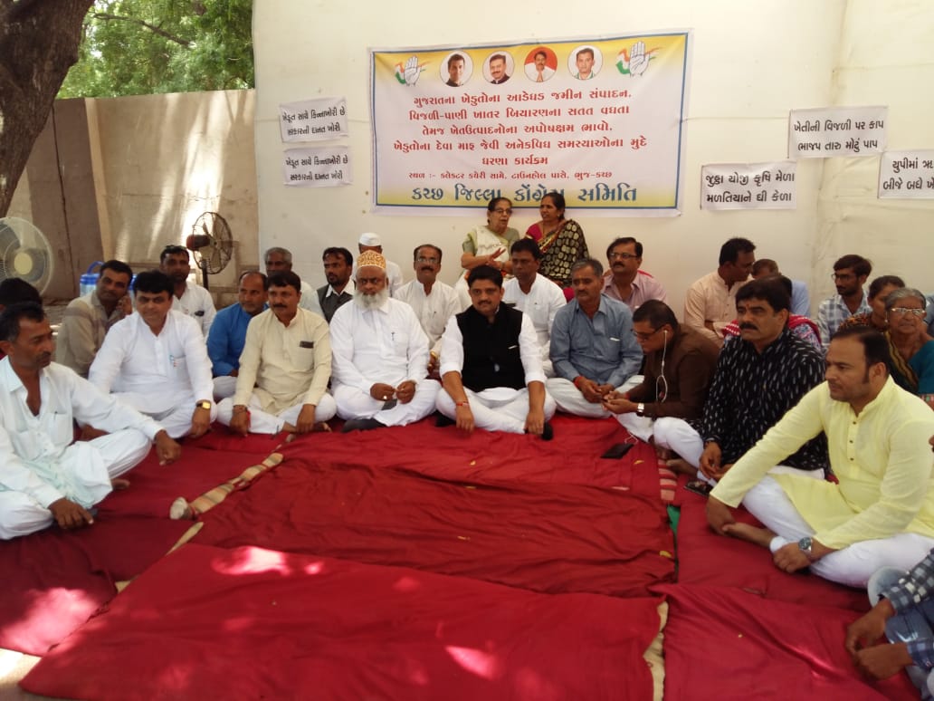 કચ્છ જિલ્લા કોંગ્રેસ પ્રમુખ યજુવેન્દ્રસિંહ જાડેજાએ ભાજપ સરકારની બેવડી ખેડૂત નીતિ ની આકરી ઝાટકણી કાઢી છે. ઉત્તરપ્રદેશ ની ભાજપ સરકારે ત્યાં ના ખેડૂતો ના દેવા માફ કર્યા છે તો ગુજરાત ની ભાજપ સરકાર ખેડૂતો ના શા માટે દેવા માફ કરતી નથી? ગુજરાત ના ખેડૂતો દેવાના બોજ નીચે દબાઈને આત્મહત્યા પણ કરી ચુક્યા છે. ચૂંટણી સમયે ભાજપે મગફળી, કપાસ ટેકાના ભાવે ખરીદ કરવાના પોષણક્ષમ ભાવ આપવાને બદલે ખેડૂતો સાથે છેતરપીંડી કરી છે, તે ઉપરાંત વીજ કાપ અને ખાતર ની તંગી તેમ જ સિંચાઈ માટે નર્મદાનું પાણી ન મળતા ખેડૂતો માટે પાક ની મુશ્કેલી વધી છે. રાજ્ય સરકારને ખેડૂતો ની સમસ્યા ઉકેલે તે માટે કોંગ્રેસ આખા દિવસ ના ધરણા કરીને ખેડૂતો ની હમદર્દી જીતી ભાજપ સરકાર ને ભીંસ માં લઇ રહી છે. પ્રદેશ મંત્રી જુમા રાયમા ના જણાવ્યા પ્રમાણે કોંગ્રેસે ગુજરાતના તમામ જિલ્લાઓ મા એક દિવસ ના ધરણા કરી ને ભાજપ સરકારને ઉંઘ માંથી જગાડી ખેડૂતો ની સમસ્યાઓ થી વાકેફ કરવાનો પ્રયાસ કર્યો છે. કોંગ્રેસનો આરોપ છે કે સરકાર ગુજરાતના ખેડૂતો ને અન્યાય કરી રહી છે તે અન્યાય દૂર થાય તે માટે કોંગ્રેસે આ આંદોલન છેડયું છે. ધારાસભ્ય પ્રદ્યુમનસિંહ જાડેજાએ અબડાસાના ખેડૂતો અને પશુપાલકો પરેશાન છે પણ સરકાર અને વહીવટીતંત્ર એમની સમસ્યા ઉકેલવા માટે બેધ્યાન છે. તો ધારાસભ્ય સંતોકબેન પટેલે નર્મદા ના પાણી ના મુદ્દે થઈ રહેલા અન્યાય અંગે નારાજગી વ્યક્ત કરી હતી. કચ્છ કોંગ્રેસના આ ધરણા આંદોલન મા જિલ્લા પ્રમુખ યજુવેન્દ્રસિંહ જાડેજા, ધારાસભ્યો પ્રદ્યુમનસિંહ જાડેજા, સંતોક બેન આરેઠીયા, પ્રદેશમંત્રી જુમા રાયમા, પૂર્વ સાંસદ ઉષાબેન ઠક્કર, ભચુભાઈ આરેઠીયા, મહિલા કોંગ્રેસના પ્રમુખ કલ્પનાબેન જોશી, નરેશ મહેશ્વરી, રશીદ સમા, રાજેન્દ્રસિંહ જાડેજા, રવિન્દ્ર ત્રવાડી, ચેતન જોશી, ગની કુંભાર, અશરફશા સૈયદ, દિપક ડાંગર, રફીક મારા સહિત ના આગેવાનો અને કાર્યકરો જોડાયા હતા. બીજા દિવસે સવારે ૧૧ વાગ્યા સુધી કોંગ્રેસ નું ધરણા આંદોલન ચાલશે.