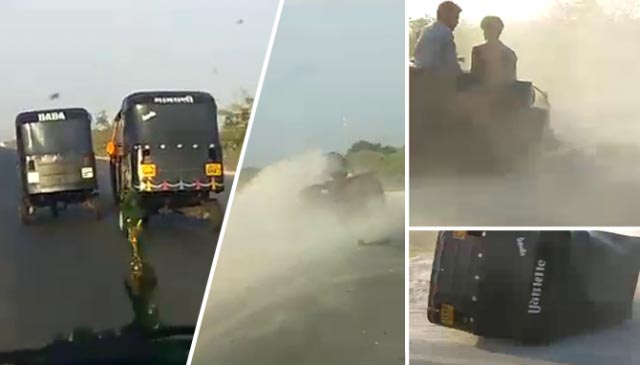 આ વિષય લોક જાગૃતિનો હોઈ અહીં આ વિગત મુકવા ની ફરજ પડી છે news4kutch દ્વારા આ વીડિઓની જાણવાનો પ્રયાસ કરાતા આ સૌ રિક્ષા ચાલક પ્રવાસીઓ હાજીપીરના મેળાની મોજ સાથે કચ્છ આવી રહ્યા હતા ત્યારે મોજ મસ્તી માં એકમેક થી આગળ થવાની લ્હાય માં આવો રોમાન્ચ અનુભવતા જોવા મળ્યા હતા અને આ હરીફાઈ ને પાછળ ચાલતા વાહનમાં બેઠેલા વ્યક્તિ મોબાઈલમાં રૅકોર્ડ કરતા હતા પરંતુ ફૂલ સ્પીડ સાથે ચાલી રહેલી મજાક મસ્તી માં અચાનક આવેલા અવરોધે મસ્તી કરનાર અને મસ્તી જોનારની અચાનક ધડકન થંભાવી દીધી હતી જોકે સદભાગ્યે આ ઘટનામાં કોઈ જાનહાની ન થઇ એ આ યુવાનોના નશીબ ગણો કે તેમની શ્રદ્ધા પરંતુ ક્ષણ ભરમાં બનેલી આ ઘટના આજના યુવાનો માટે લાલબત્તી સમાન ચોક્કસ કહી શકાય